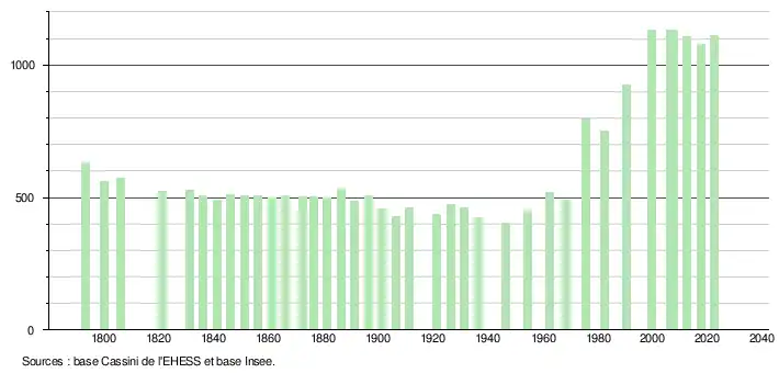 L'évolution du nombre d'habitants est connue à travers les recensements de la population effectués dans la commune depuis 1793. Pour les communes de moins de 10 000 habitants, une enquête de recensement portant sur toute la population est réalisée tous les cinq ans, les populations de référence des années intermédiaires étant quant à elles estimées par interpolation ou extrapolation[21]. Pour la commune, le premier recensement exhaustif entrant dans le cadre du nouveau dispositif a été réalisé en 2007[22].