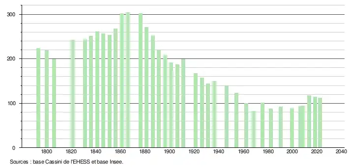 | L'évolution du nombre d'habitants est connue à travers les recensements de la population effectués dans la commune depuis 1793. Pour les communes de moins de 10 000 habitants, une enquête de recensement portant sur toute la population est réalisée tous les cinq ans, les populations de référence des années intermédiaires étant quant à elles estimées par interpolation ou extrapolation[21]. Pour la commune, le premier recensement exhaustif entrant dans le cadre du nouveau dispositif a été réalisé en 2008[22]. En 2022, la commune comptait 112 habitants[Note 4], en évolution de −11,11 % par rapport à 2016 (Hautes-Pyrénées : +1,59 %, France hors Mayotte : +2,11 %). |