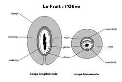 Le fruit, l'olive, est une drupe, dont la peau (épicarpe) est recouverte d'une matière cireuse imperméable à l'eau (la pruine), avec une pulpe (mésocarpe) charnue riche en matière grasse stockée durant la lipogenèse, de la fin août jusqu'à la véraison. D'abord vert, il devient noir à maturité complète. Le noyau très dur, osseux, est formé d'une enveloppe (endocarpe) qui se sclérifie l'été à partir de la fin juillet, et contient une amande avec deux ovaires, dont l'un est généralement stérile et non fonctionnel : cette graine (rarement deux) produit un embryon, qui donnera un nouvel olivier si les conditions sont favorables.