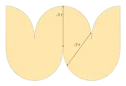On considère maintenant l'enveloppe convexe de ces deux cercles (traits verts). On remarque alors qu'une portion de chaque cercle se trouve à l'intérieur de l'enveloppe convexe. Cela montre que l'on aurait pu aussi définir l'oloïde comme l'enveloppe convexe d'arcs de cercle d'angle 240° chacun (dessinés sur la figure en noir).