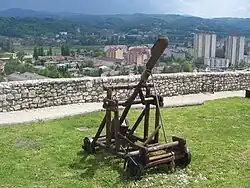 À l'origine, le mot « catapulte » désigne un engin lanceur de flèches, alors que le terme « baliste » fait référence à une machine qui lance des pierres, mais la signification des deux termes a été intervertie à partir du IVe siècle de notre ère, d’où parfois une certaine confusion dans les termes. Le fait que le mot catapulte (qui est devenu un nom commun : « catapulter ») soit devenu un terme générique, qui à certaines époques désigne indistinctement tous les engins de siège de la baliste au trébuchet, obscurcit encore la terminologie[réf. nécessaire].