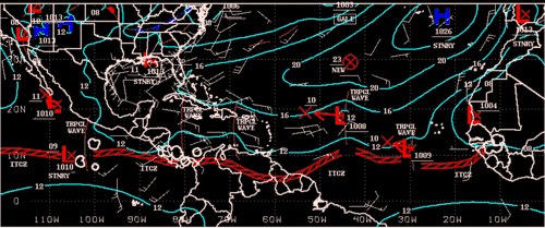 La carte de droite, tirée du site du National Weather Service américain, montre la zone de convergence intertropicale marquée par une zone de basses pressions délimitée par l'isobare 1012 hectopascals. Au sud, cet isobare est uniformément courbe autour de 0° (équateur géographique). Au nord, l'isobare situé par 10° environ de latitude Nord, montre de multiples ondulations. Ce sont des creux barométriques, soulignés par les arcs de couleur marron. Ces creux sont les ondes tropicales. Ces creux affectent l'anticyclone des Açores, en faisant remonter par endroits l'isobare 1016.