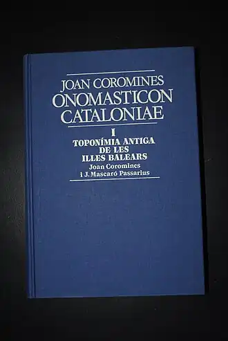 - ↑ (es) Montserrat Casals, El primer volumen de 'Onomasticon Cataloniae', la obra monumental de Joan Coromines, a punto de editarse, El País, 30/09/1988.