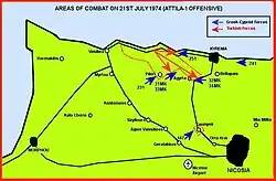 À Kyrenia, le 251e bataillon s'est maintenant déplacé vers le village de Trimithi pour défendre la ville, tandis que le 241e et le bataillon de génie se déplacent à l'est de Kyrenia, le dernier ayant pour mission de miner la côte. Au col Agyrta-Nicosie, les forces de commando de montagne chypriotes grecques atteignent leurs objectifs, les 31MK et 33MK arrivant de l'ouest pour capturer le sommet de la montagne Kotsakagia, tandis que les 32MK arrivent de l'est pour forcer une retraite turque du col[35]. Dans un mouvement stratégique désastreux, les quatre bataillons de commando de montagne chypriotes grecs sont ordonnés de quitter les montagnes de Pentedaktylos (où ils ont créé un quasi blocus de la ligne d'une tête de pont turque) et sont envoyés en direction d'Agios Pavlos[29]. Le bataillon d'artillerie 187MPP, qui est gravement endommagé par l'attaque aérienne turque sur son camp la veille, entre en bataille avec seulement quatre canons de 100 mm survivants sur douze. Le jour précédent, il a tiré un certain nombre de coups sur l'enclave chypriote turque dans le nord de Nicosie, ainsi que sur Saint-Hilarion. Le 21, il se déplace vers une nouvelle position à Gerolakkos sous le couvert de la nuit, et bombarde Saint-Hilarion en soutien aux forces de la Garde nationale et de l'ELDYK[39].