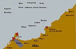 Vers 10h00, un obus de 152 mm du Brooklyn touche le PC de conduite de tir de la batterie de Pont Blondin. De plus, un coup direct a détruit l'un des canons de 138 mm, le jetant hors de son chariot et faisant exploser une pile adjacente de munitions. Ce sont les deux seuls impacts directs marqués sur le site de la batterie. Une vingtaine de soldats français ont été tués ou blessés par les coups et les explosions qui ont suivi. Profitant de la confusion qui en a résulté, les Américains ont pris d'assaut la colline et, après un bref échange de tirs, ont capturé la zone de la batterie vers 10h30. 72 soldats français sont faits prisonniers.