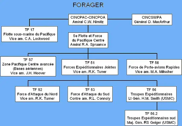 L'amiral Raymond Spruance, l'artisan de la victoire de Midway, fut désigné comme commandant en chef de la 5e Flotte et de toutes les forces du Pacifique Central et serait donc le commandant de toutes les unités impliquées dans Forager.