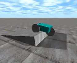 Un simple véhicule en train de rouler sur une rampe. Cette démo est distribuée avec le code source d'ODE (demo_buggy).
