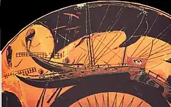 L'utilisation d'ophthalmoi comme éléments décoratifs de navires de guerre grecs est bien connu, car ceux-ci sont mentionnés dans des inventaires de trières du IVe siècle[2]. On peut voir ces ornements en forme d'yeux sur des vases archaïques et classiques. La plus ancienne représentation d’un ophthalmos sur la proue d'un bateau de guerre dont nous ayons connaissance figure sur le cratère d’Aristonothos[3], trouvé à Cerveteri (alors en Étrurie), vase daté du deuxième quart du VIIe siècle avant l'ère chrétienne et conservé aujourd'hui à Rome, aux Musées du Capitole[4].
