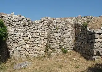 Le rempart offre un ensemble monumental, plusieurs fois remanié après sa construction en lauzes de travertin dès le deuxième quart du VIe siècle av. J.-C. Une technique locale a été utilisée pour sa construction, associant une courtine à une tour ovoïde. Le rempart nord présente une courtine de 2,5 m d'épaisseur, construite en blocs irréguliers de tuf de 0,6 x 0,5 m.