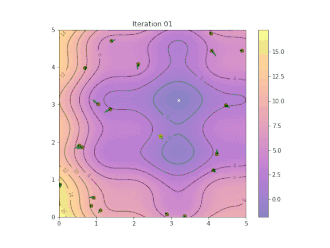 Ainsi, grâce à des règles de déplacement très simples (dans l'espace des solutions), les particules peuvent converger progressivement vers un minimum global. Cette métaheuristique semble cependant mieux fonctionner pour des espaces en variables continues.