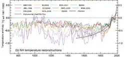 - ↑ (en) M. E. Mann, Z. Zhang, S. Rutherford, R. S. Bradley, M. K. Hughes, D. Shindell, C. Ammann, G. Faluvegi et F. Ni, « Global Signatures and Dynamical Origins of the Little Ice Age and Medieval Climate Anomaly », Science, vol. 326, no 5957, , p. 1256–60 (PMID 19965474, DOI 10.1126/science.1177303, Bibcode 2009Sci...326.1256M).