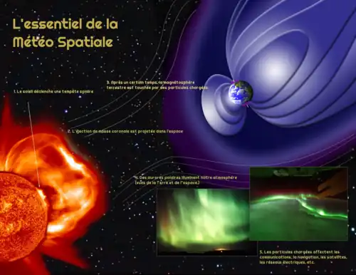 La magnétosphère est d'abord comprimée lorsque la pression du vent solaire augmente. Le champ magnétique du vent solaire interagit alors avec le champ magnétique de la Terre, transférant plus d'énergie dans celle-ci. Les deux interactions engendrent la mobilité du plasma dans la magnétosphère, ce qui amène la création d'un courant électrique dans la magnétosphère et l'ionosphère[3]. Pendant la phase principale d'un orage géomagnétique, le courant électrique dans la magnétosphère génère une force magnétique qui pousse la barrière magnétosphère-vent solaire en sens opposé du Soleil[6]. Ces phénomènes sont responsables d'un certain nombre d'évènements météorologiques spatiaux[7].