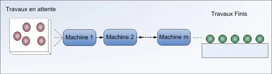 • le nombre de solutions possibles est de l’ordre de (n!)m, où n est le nombre de tâches à effectuer et m le nombre de machines. Notons qu’une tâche veut dire la même chose qu’un travail.