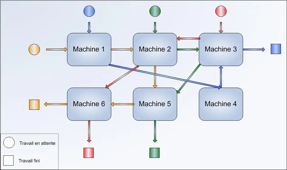 La figure suivante montre un exemple d’un atelier à cheminements multiples avec quatre travaux et six machines.