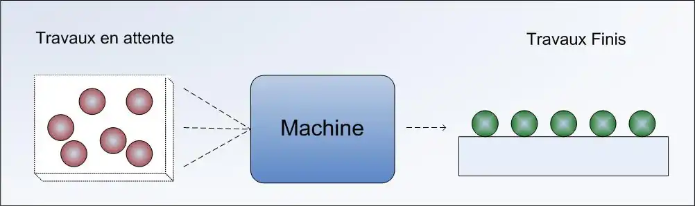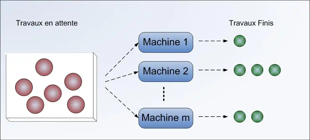 Dans ce cas, on dispose d’un ensemble de machines identiques pour réaliser les travaux. Les travaux se composent d’une seule opération et un travail exige une seule machine. L’ordonnancement s’effectue en deux phases : la première phase consiste à affecter les travaux aux machines et la deuxième phase consiste à établir la séquence de réalisation sur chaque machine.