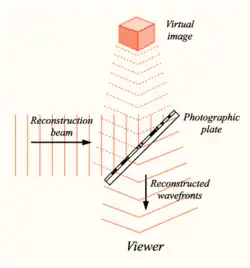 Quand un hologramme – résultant d'une figure d'interférence entre deux portions de lumière laser – est impressionné sur une pellicule photographique, celle-ci peut être coupée en deux sans jamais perdre une seule moitié de l'image d'origine, qui reste complète (bien qu'avec une certaine perte de résolution)[32],[33]. L'image complète persiste même si les deux moitiés de la pellicule sont elles-mêmes sectionnées en de plus petits éléments. Chaque partie de la pellicule contient en effet tout l'espace nécessaire à la restitution complète de l'image. Dans l'analogie de l'hologramme, la surface de la pellicule photographique contenant les informations visuelles devient alors la métaphore de l'ordre implicite, tandis que l'hologramme lui-même représente l'ordre explicite, c'est-à-dire l'explicitation dans notre réalité d'un ordre caché où chaque partie renferme l'ordre total. Le « mouvement holographique » est représenté quant à lui par la lumière laser projetée sur la plaque photographique, illustrant le caractère dynamique de la réalité holographique[34].