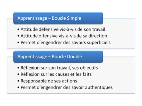 Pour Chris Argyris et Donald Schön, il y a deux niveaux d'apprentissage. Il y a apprentissage en « simple boucle » (single loop) lorsque les acteurs sont capables de détecter une erreur et se contentent de la corriger. Il y a apprentissage en « double boucle » (double loop) lorsqu'il ne s'agit plus seulement de corriger une erreur mais de modifier la façon de penser[20]. Seule l'organisation capable de modifier les valeurs qui guident les stratégies d'action peuvent être qualifiées d'« organisation apprenantes ». La communication réflexive commune est alors un élément incontournable de la production, il s’agit de réfléchir pour agir, les acteurs sont aussi des chercheurs, mais surtout des trouveurs impliqués dans l’action. L’organisation apprenante permettra d’apprendre à apprendre de son expérience.