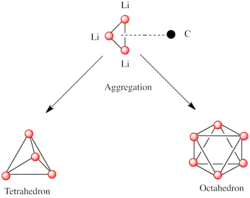 Comme de nombreuses autres espèces chimiques constituées de sous-unités polaires, les organolithiens forment des agrégats[11],[18]. La formation de ces agrégats est facilitée par les interactions électrostatiques, la coordination entre l'atome de lithium et les molécules de solvant environnantes ou les additifs polaires, et des effets stériques[11].