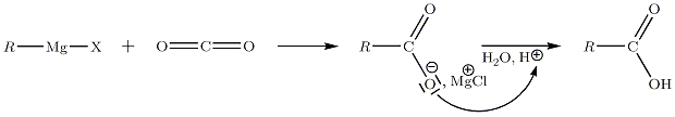 On utilise le dioxyde de carbone à l'état de carboglace. La réaction à −40 °C conduit à la formation d'un acide carboxylique R-COOH.