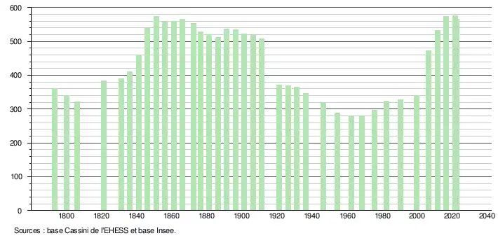 L'évolution du nombre d'habitants est connue à travers les recensements de la population effectués dans la commune depuis 1793. Pour les communes de moins de 10 000 habitants, une enquête de recensement portant sur toute la population est réalisée tous les cinq ans, les populations de référence des années intermédiaires étant quant à elles estimées par interpolation ou extrapolation[15]. Pour la commune, le premier recensement exhaustif entrant dans le cadre du nouveau dispositif a été réalisé en 2006[16].