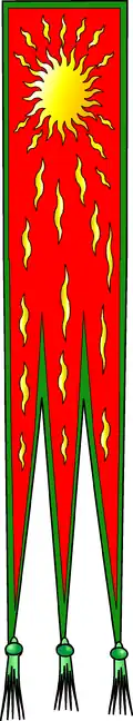 - Au XIVe siècle, on connaît trois exemples qui ratifient l'existence d'un étendard rouge, à trois queues ornées de houppes ou d'une frange[5].