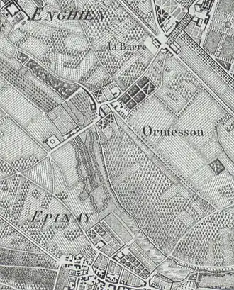 Au XVIIIe siècle, des Parisiens ont des maisons de campagne à Ormesson, avec des jardins clos et des vergers[4]. Ce lieu-dit d'Ormesson est indiqué sur la carte de Delagrive[5], sur la carte de Cassini (1754, carte à gauche), entre Épinay, Saint-Gratien et Deuil et sur la carte dite des Chasses impériales, dressée de 1764 à 1773 (voir infobox)[6].
