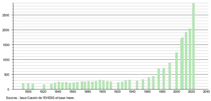 L'évolution du nombre d'habitants est connue à travers les recensements de la population effectués dans la commune depuis 1793. Pour les communes de moins de 10 000 habitants, une enquête de recensement portant sur toute la population est réalisée tous les cinq ans, les populations de référence des années intermédiaires étant quant à elles estimées par interpolation ou extrapolation[47]. Pour la commune, le premier recensement exhaustif entrant dans le cadre du nouveau dispositif a été réalisé en 2007[48].