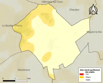 Le retrait-gonflement des sols argileux est susceptible d'engendrer des dommages importants aux bâtiments en cas d’alternance de périodes de sécheresse et de pluie. 29,8 % de la superficie communale est en aléa moyen ou fort (52,8 % au niveau départemental et 48,5 % au niveau national). Sur les 96 bâtiments dénombrés sur la commune en 2019, 5 sont en aléa moyen ou fort, soit 5 %, à comparer aux 70 % au niveau départemental et 54 % au niveau national. Une cartographie de l'exposition du territoire national au retrait gonflement des sols argileux est disponible sur le site du BRGM[16],[Carte 2].