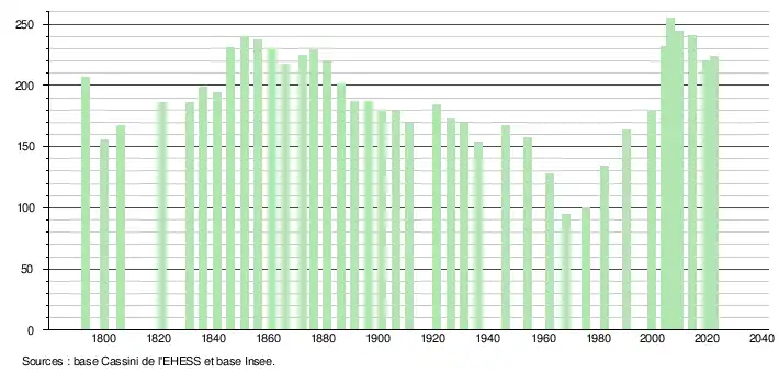 L'évolution du nombre d'habitants est connue à travers les recensements de la population effectués dans la commune depuis 1793. Pour les communes de moins de 10 000 habitants, une enquête de recensement portant sur toute la population est réalisée tous les cinq ans, les populations de référence des années intermédiaires étant quant à elles estimées par interpolation ou extrapolation[21]. Pour la commune, le premier recensement exhaustif entrant dans le cadre du nouveau dispositif a été réalisé en 2004[22].