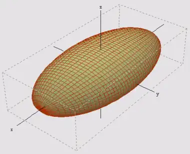 Une autre question impose une nouvelle généralisation. Depuis Newton, la trajectoire des planètes, essentiellement sous l'influence du Soleil, est relativement bien connue. Cependant, les planètes s'attirent entre elles, créant de petites perturbations par rapport à l'approximation de Newton, appelées variations séculaires. Lagrange cherche à démontrer que les variations du premier ordre ne peuvent déstabiliser le système[17]. Augustin Louis Cauchy (1789 - 1857) découvre que cette question est aussi associée à une forme quadratique. Il remarque qu'une équation de type (1) généralisée à la dimension trois définit une surface quadrique comme l'ellipsoïde de la figure de droite. Trouver les bons vecteurs orthogonaux pour cette quadrique lui permet de les classifier toutes[18]. Cette méthode résout aussi la question de Lagrange dans le cas où seulement trois planètes sont prises en compte[19].