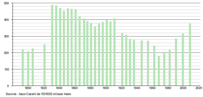 L'évolution du nombre d'habitants est connue à travers les recensements de la population effectués dans la commune depuis 1793. À partir du , les populations légales des communes sont publiées annuellement dans le cadre d'un recensement qui repose désormais sur une collecte d'information annuelle, concernant successivement tous les territoires communaux au cours d'une période de cinq ans. Pour les communes de moins de 10 000 habitants, une enquête de recensement portant sur toute la population est réalisée tous les cinq ans, les populations légales des années intermédiaires étant quant à elles estimées par interpolation ou extrapolation[42]. Pour la commune, le premier recensement exhaustif entrant dans le cadre du nouveau dispositif a été réalisé en 2008[43],[Note 3].