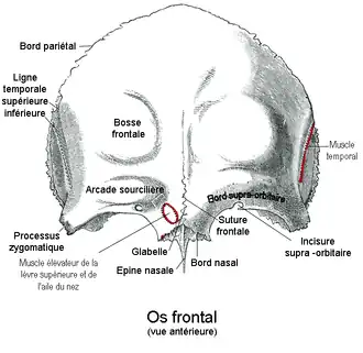 • sur la ligne médiane et chez le sujet jeune, une ligne de suture qui généralement s'estompe avec l'âge. En moyenne vers l'âge de 6 ans, elle ne reste visible que dans la partie basse de l'os et forme la suture métopique ou suture frontale. Au bas de cette ligne, se trouve une bosse : la glabelle,