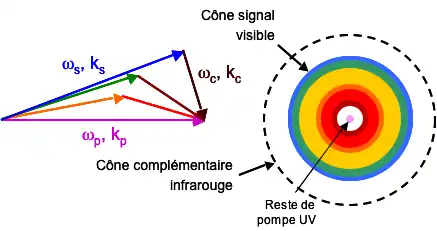 Lorsque le milieu non linéaire est éclairé par un faisceau de lumière cohérente de fréquence ωp, appelé faisceau de pompe, deux autres faisceaux sont produits : le faisceau signal de fréquence ωs et le faisceau complémentaire de fréquence ωc. Il n'existe pas de convention générale pour définir le signal par rapport au complémentaire (même si dans la majorité des publications sur le sujet le signal a la longueur d'onde la plus courte des deux). Les fréquences signal et complémentaire sont forcément inférieures à la fréquence de pompe, et doivent impérativement satisfaire la relation suivante :