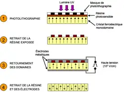 Pour réaliser l'inversion périodique de la non-linéarité, il existe plusieurs techniques. Dans les cristaux ferroélectriques comme le niobate de lithium, le titanyl phosphate de potassium (KTP) et le titanyl phosphate de rubidium (RTP), le retournement se fait par l'application d'un champ électrique très intense (voir figure ci-contre). La période du réseau ainsi créé peut aller de quelques dizaines de μm à quelques μm, la résolution de cette technique ne permettant pas de descendre plus bas. Si une période plus petite est nécessaire, il est possible d'appliquer très localement le champ électrique par un microscope à force atomique (AFM), ou bien de provoquer le retournement des domaines par un faisceau d'électrons focalisé (analogue à celui d'un microscope électronique à balayage), ce qui permet de descendre en dessous de 1 μm. En revanche, avec ces techniques l'ouverture des cristaux est généralement limitée à quelques mm, ce qui limite le diamètre des faisceaux pouvant s'y propager, et limite l'acceptance angulaire du cristal.