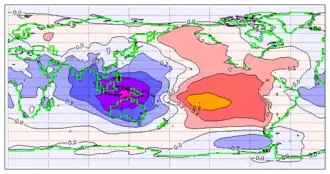 Cela permet à l'eau chaude empilée dans le Pacifique Ouest de dévaler la pente vers l'Amérique du Sud, ce qui change la température de surface de la mer dans ce secteur en plus de perturber les courants marins. Cela change également complètement le patron nuageux et pluviométrique en plus de donner des températures inhabituelles aux deux Amériques, à l'Australie et à l'Afrique du Sud-Est.