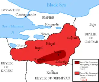 Selon la tradition ottomane tardive, les ancêtres d'Osman étaient des descendants de la tribu Kayı des Turcs Oghouzes[34]. La principauté ottomane n'était qu'un des nombreux beyliks anatoliens apparus dans la seconde moitié du XIIIe siècle. Située dans la région de Bithynie au nord de l'Anatolie (Asie Mineure), la principauté d'Osman s'est trouvée particulièrement bien placée pour lancer des attaques contre l'empire byzantin vulnérable, que ses descendants finissent par conquérir. Selon la tradition ottomane, le père d'Osman, Ertuğrul, a conduit la tribu turcique Kayı à l'ouest de l'Asie centrale en Anatolie, fuyant l'attaque mongole. Il a ensuite prêté allégeance au sultan des Seldjoukides d'Anatolie, qui lui a accordé la domination sur la ville de Söğüt à la frontière byzantine[35]. Ce lien entre Ertuğrul et les Seldjoukides, cependant, a été largement inventé par les chroniqueurs judiciaires un siècle plus tard, et les véritables origines des Ottomans restent donc obscures[36].
