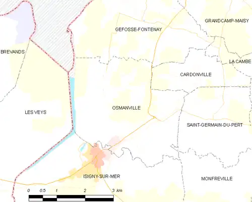 De 1847 à 1862, la commune d'Isigny tente d'absorber la commune d'Osmanville. Après de nombreuses années de tractations, le , une loi est promulguée. Celle-ci rattache la commune de Saint-Clément, peuplée de 168 habitants en 1856[32] (au nord-ouest), à Osmanville (586 habitants[33]) et permet un échange de terrain entre les deux communes d'Osmanville et d'Isigny (la zone portuaire d'Osmanville est échangée contre des terrains sis entre la rivière Aure et le village de Montaure)[réf. nécessaire].