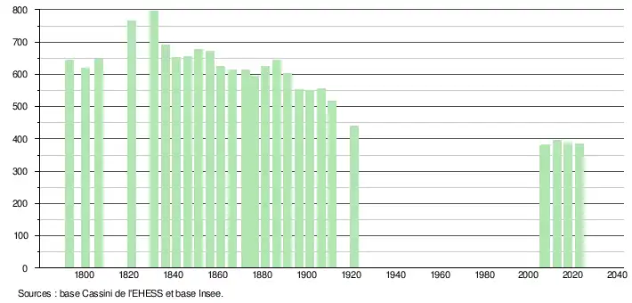 L'évolution du nombre d'habitants est connue à travers les recensements de la population effectués dans la commune depuis 1793. Pour les communes de moins de 10 000 habitants, une enquête de recensement portant sur toute la population est réalisée tous les cinq ans, les populations de référence des années intermédiaires étant quant à elles estimées par interpolation ou extrapolation[19]. Pour la commune, le premier recensement exhaustif entrant dans le cadre du nouveau dispositif a été réalisé en 2007[20].