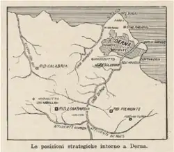 Le , l'armée italienne entreprend de conquérir la Libye, alors territoire ottoman, et débarque en plusieurs points de la côte libyenne. Elle prend Derna aux Ottomans le [16]. La défense ottomane s'organise à partir de Aïn al-Mansour dans l'oued Derna, à 15 km au sud de la ville où Enver Pacha établit son quartier général. Ce dernier prend ensuite le commandement des forces ottomanes à Benghazi et Mustafa Kemal qui, sous le nom d'Atatürk deviendra le père de la Turquie moderne le remplace à Aïn al-Mansour. Les troupes régulières turques, appuyées par des forces tribales libyennes, tentent de couper l'eau aux Italiens, menant des raids le long de l'oued[17]. Le 24 novembre, une mission de reconnaissance italienne progressant le long de la rive orientale de l'oued est prise en embuscade par les Ottomans. Un bataillon d'Alpini est appelé en renfort, ce qui permet aux Italiens de se dégager, après 8 heures de combats et après des pertes importantes, 15 morts et 37 blessés[17]. Le 27 décembre, les Ottomans coupent l'aqueduc qui ravitaille Derna en eau depuis les sources de l'oued. Des ingénieurs sont chargés de réparer l'adduction d'eau et trois colonnes de l'armée munies d'artillerie de montagne, une de chaque côté de la gorge et une dans le lit de l'oued, sont chargées de les protéger. Les Ottomans harcèlent les colonnes qui doivent battre en retraite vers Derna, abandonnant de l'artillerie. Les Italiens en sont alors réduits à faire venir d'Italie par bateau leur eau, ce qui s'avère très onéreux. L'armée italienne entreprend alors de construire deux forts, Piemonte et Lombardia, de chaque côté de l'oued à proximité de Derna pour sécuriser l'approvisionnement en eau de la ville. Les deux édifices sont achevés en mars-avril 1912 et mettent fin aux raids ottomans à proximité de Derna[17].