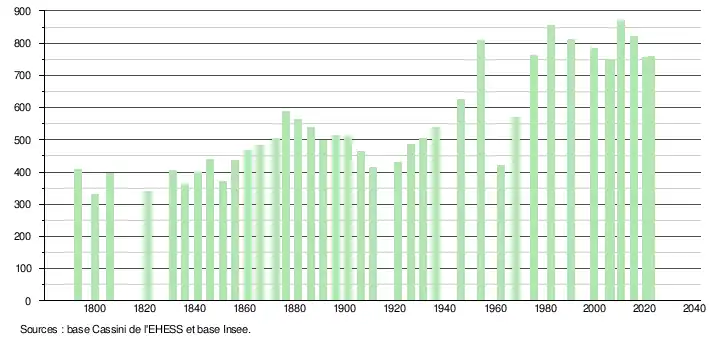 L'évolution du nombre d'habitants est connue à travers les recensements de la population effectués dans la commune depuis 1793. Pour les communes de moins de 10 000 habitants, une enquête de recensement portant sur toute la population est réalisée tous les cinq ans, les populations de référence des années intermédiaires étant quant à elles estimées par interpolation ou extrapolation[33]. Pour la commune, le premier recensement exhaustif entrant dans le cadre du nouveau dispositif a été réalisé en 2005[34].