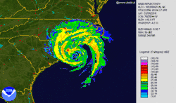 Images du radar météorologique montrant les bandes de précipitations de Bertha au moment où l'ouragan touchait la côte de la Caroline du Nord.