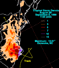 La zone la plus affectée a été l'est de la Caroline du Nord et le sud de la Virginie, là où Dennis est entré dans les terres. Il est tombé un maximum de 506 mm à Ocracoke, dans les Outer Banks, et de 170 mm à 400 mm dans le reste de cette zone ce qui a causé des inondations importantes[2]. Comme Dennis est resté plusieurs jours près de la côte avant d'entrer dans les terres, il a causé beaucoup d'érosion des plages et des routes côtières. En particulier, les habitants de l'île Hatteras et de celle d'Ocracoke ont été coupés du monde durant plusieurs jours à la suite de la fermeture de la route 12 qui parcourt les Outer Banks[3].