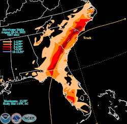 Les pluies les plus fortes se sont retrouvées juste au nord de la trajectoire de la tempête avec des valeurs allant de 100 à 300 mm et un maximum de 13,55 pouces (344 mm) à Holly Hill en Caroline du Sud[70]. Dans le sud-ouest de la Caroline du Nord, plus de 230 mm de pluie sont tombés à Whiteville, inondant le centre-ville et faisant déborder les cours d'eau de la région[62]. Trois faibles tornades ont frappé la Caroline du Nord à St. James et Myrtle Grove[84].