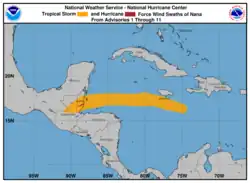 - ↑ (en) Beven, « Tropical Storm Nana Special Advisory Number 6A », National Hurricane Center, (consulté le ).
