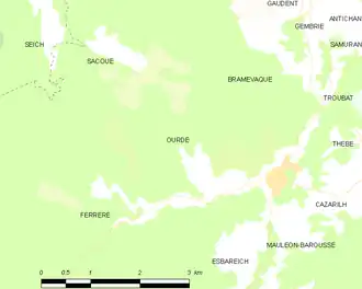 Carte de la commune de Ourde et des proches communes.