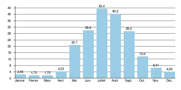 Le débit moyen mensuel observé en février (minimum d'étiage) est de 1,73 m3/s, soit seulement 4 % du débit moyen du mois de juillet, maximum de l'année (43,4 m3/s), ce qui souligne l'amplitude élevée des variations saisonnières. Ces écarts de débit mensuel peuvent être encore plus importants d'après les années. Ainsi sur la durée d'observation de 59 ans, le débit mensuel minimal a été de 0,53 m3/s en , tandis que le débit mensuel maximal s'élevait à 135 m3/s en .