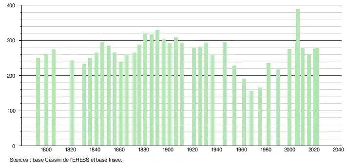 - ↑ Fiches Insee - Populations de référence de la commune pour les années 2006, 2007, 2008, 2009, 2010, 2011, 2012, 2013, 2014, 2015, 2016, 2017, 2018, 2019, 2020, 2021 et 2022.