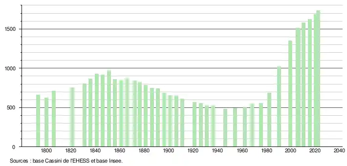 L'évolution du nombre d'habitants est connue à travers les recensements de la population effectués dans la commune depuis 1793. Pour les communes de moins de 10 000 habitants, une enquête de recensement portant sur toute la population est réalisée tous les cinq ans, les populations de référence des années intermédiaires étant quant à elles estimées par interpolation ou extrapolation[15]. Pour la commune, le premier recensement exhaustif entrant dans le cadre du nouveau dispositif a été réalisé en 2005[16].