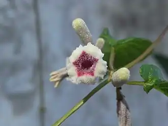 Les fleurs sont regroupées en panicules. Elles sont tubulaires, blanches, avec un cœur poilu, rose foncé ou pourpre. Leur odeur est très forte[1].