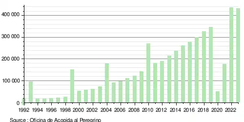 Depuis les années 1990, le pèlerinage de Saint Jacques connaît une forte croissance de fréquentation, de près de 11 % par an, avec des pics marqués lors des années jacquaires (en moyenne, 100 000 pèlerins en plus que l'année précédente)[42],[43]. À peine 10 000 en 1992, les pèlerins sont 50 000 en l'an 2000, plus de 200 000 en 2013, 300 000 en 2018, 430 000 en 2022 (année jacquaire, prolongeant celle de 2021), 438 000 en 2023[44] et 496 000 en 2024[45]. La pandémie de Covid-19 entraîne une chute brutale la première année, puis la fréquentation retrouve en deux ans la tendance générale battant le précédent record. Le Bureau d'accueil des pèlerins (Oficina de Acogida de pereginos) met à jour mensuellement les statistiques d'arrivée des pèlerins[46]. En 2022, 2023 et 2024, la fréquentation du pèlerinage atteint de nouveaux records[47]. Ces records historiques d'affluence constituent néanmoins un défi majeur pour la ville de Saint-Jacques-de-Compostelle[48] en terme d'accueil et de promiscuité avec les habitants[49],[50],[51],[52],[53].